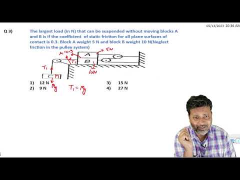The largest load (in N) that can be suspended without moving blocks A and B is if the coefficient of static friction for all plane surfaces of contact is 0.3. Block A weight 5 N and block B weight 10 N(Neglect friction in the pulley system)